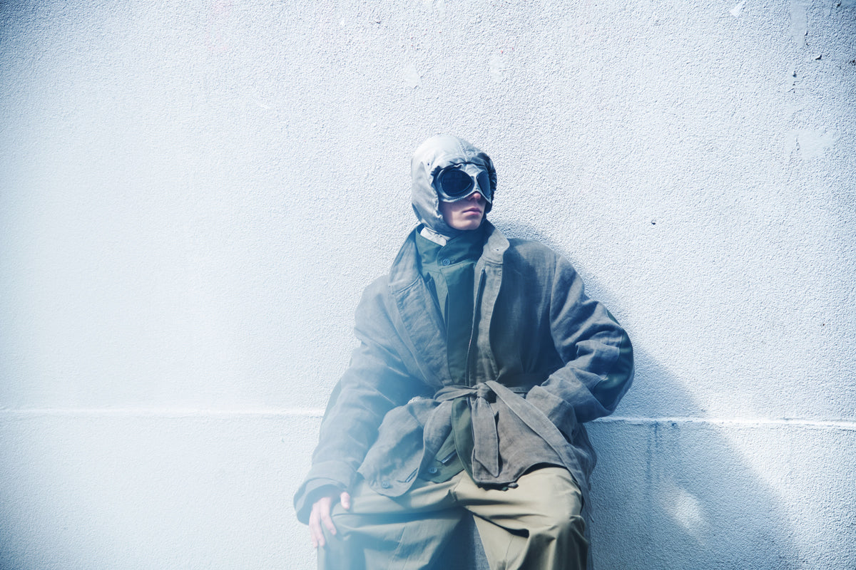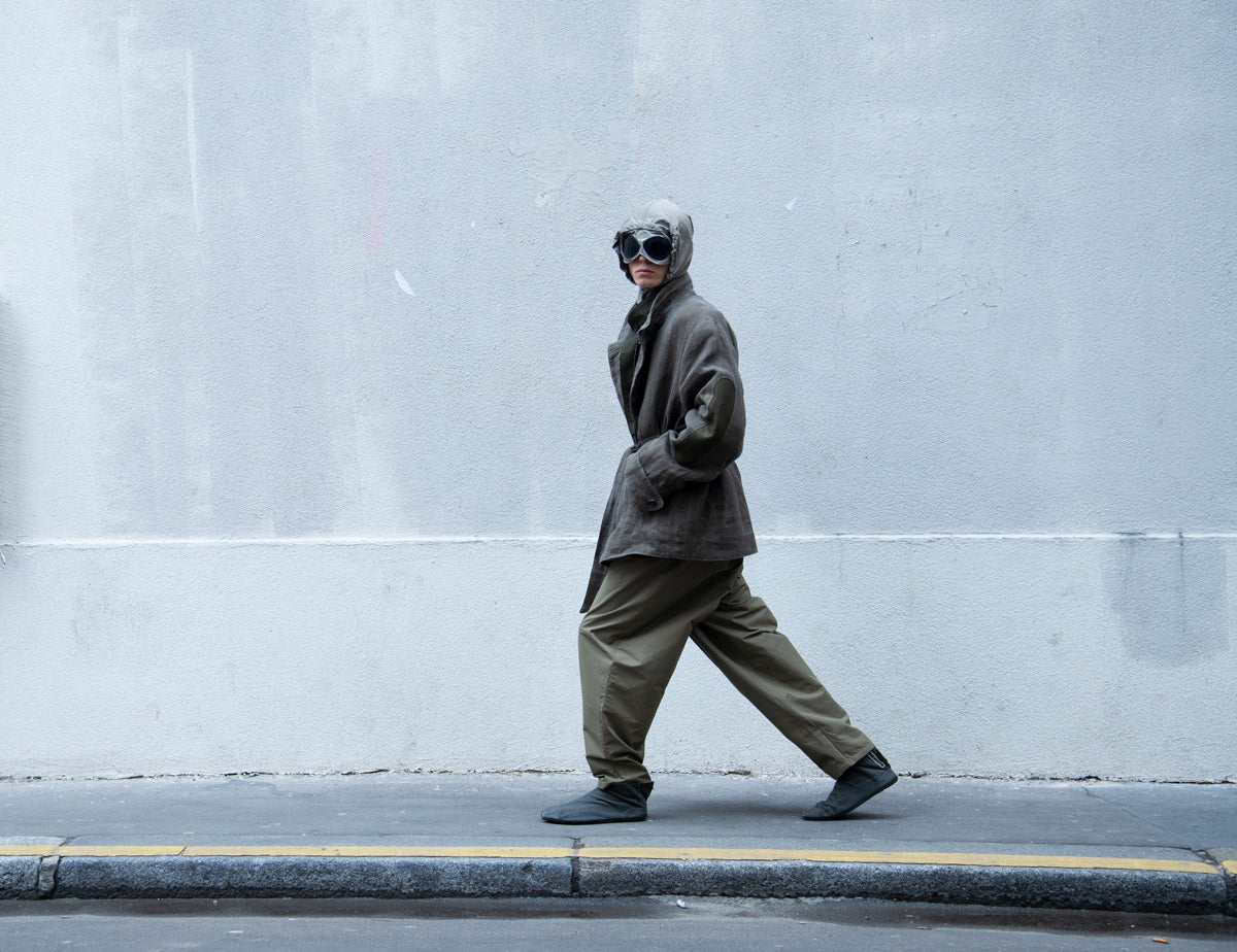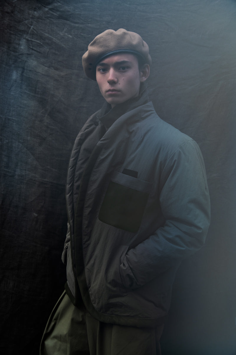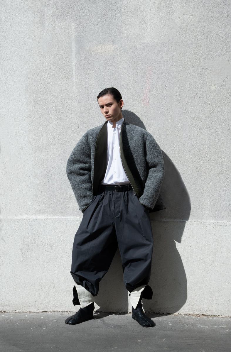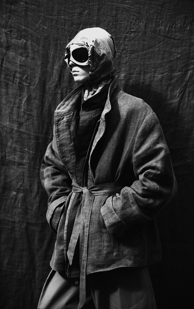 Similarly, Gabriel Stunz’s collection reinterprets classic garments with modern, structured silhouettes. Collars rise toward the chin, seams emphasize shape, and tailoring contrasts boxy coats with fluid bottoms. Using high-tech fabrics from military suppliers—resin-coated cottons, recycled polyamides, and oiled linens—his designs integrate advanced materials without glorifying war. Instead, they provide protection and shelter, placing the human experience at the center. Minimal functional details enhance aesthetics, while transparent mesh structures garments, symbolizing the essentials one carries.