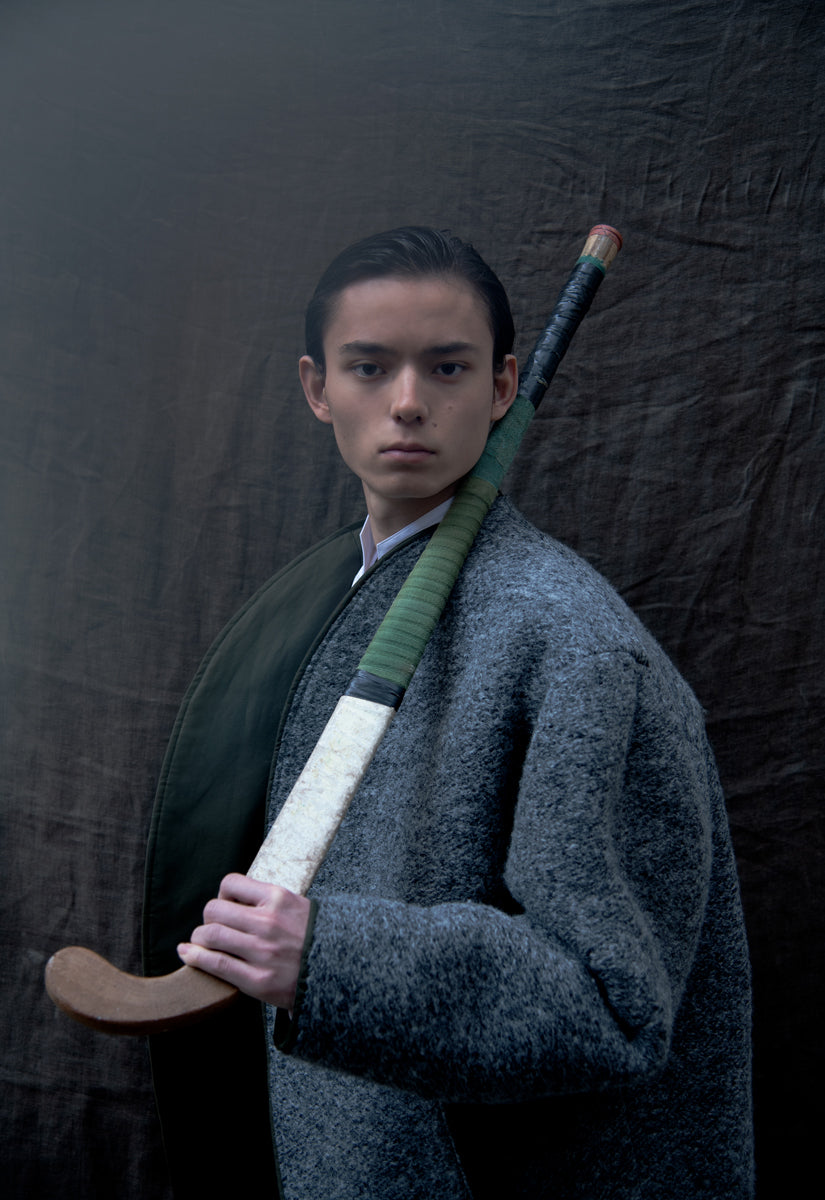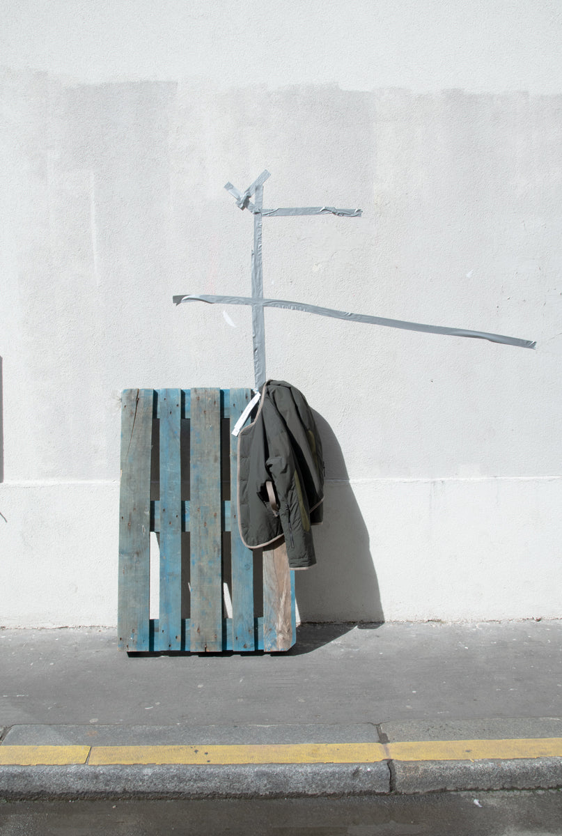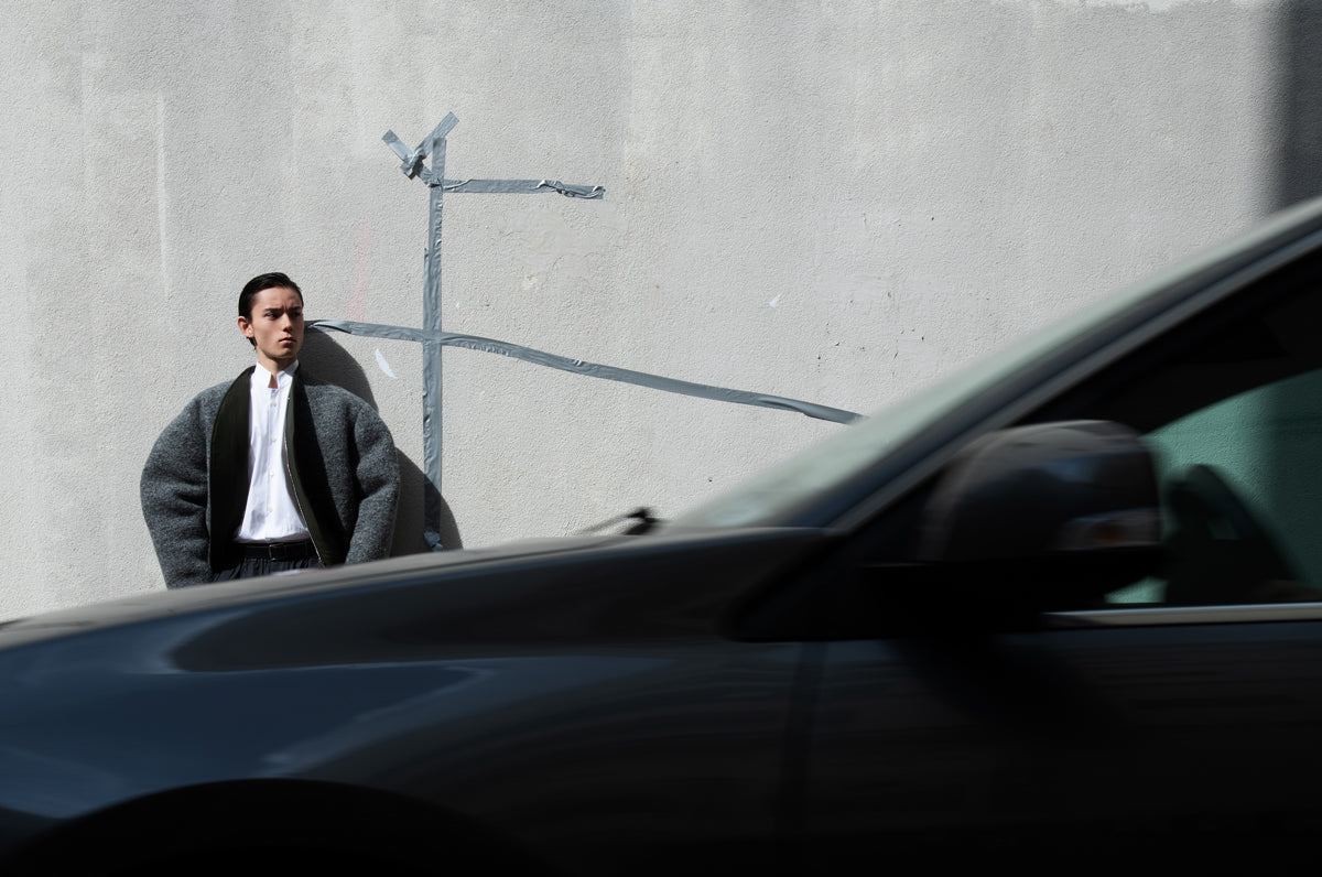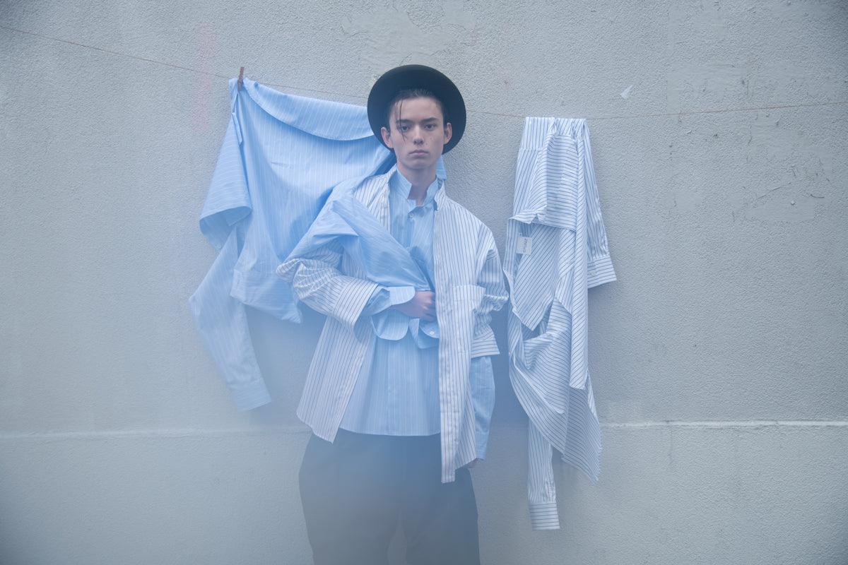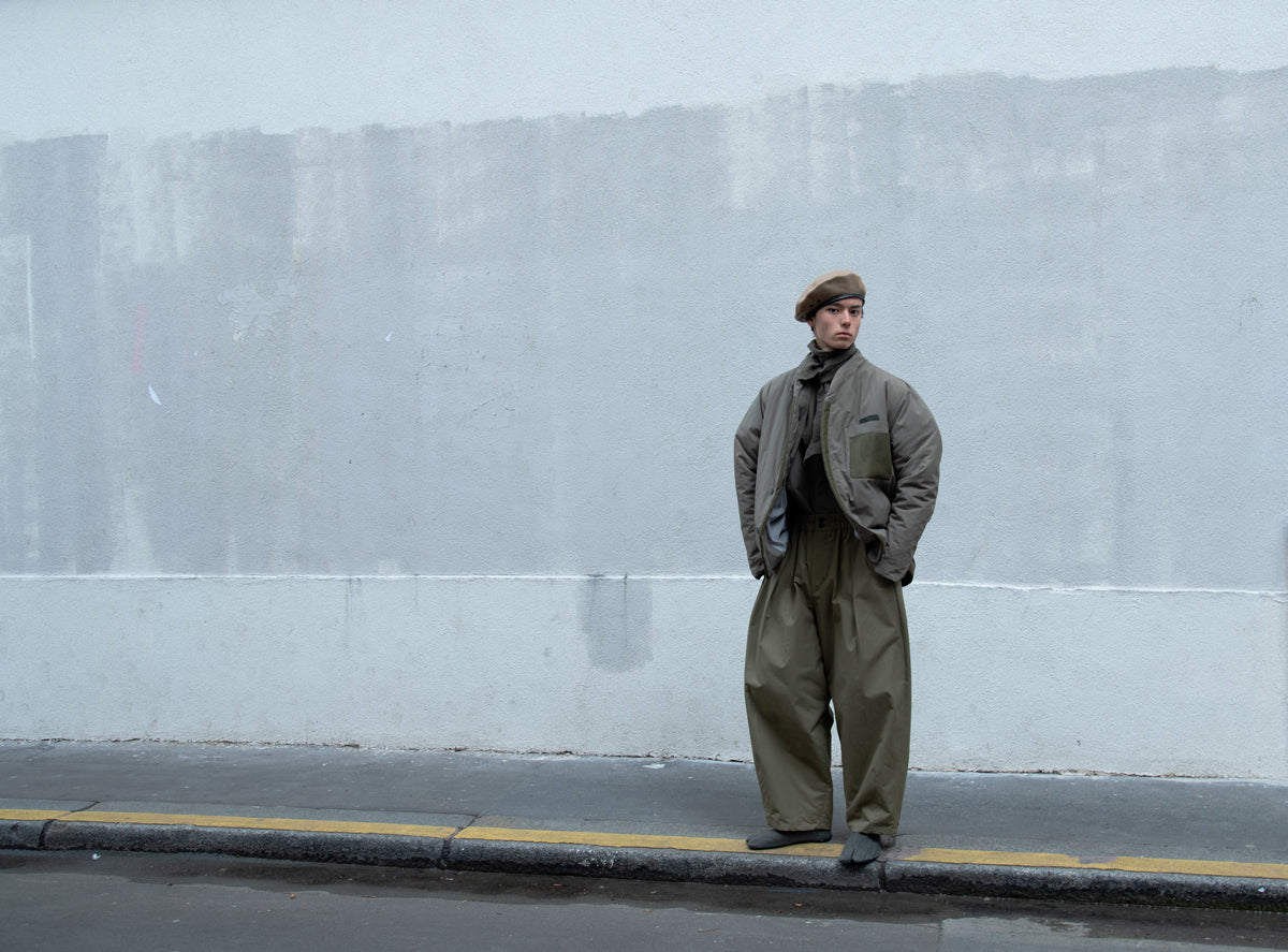 Similarly, Gabriel Stunz’s collection reinterprets classic garments with modern, structured silhouettes. Collars rise toward the chin, seams emphasize shape, and tailoring contrasts boxy coats with fluid bottoms. Using high-tech fabrics from military suppliers—resin-coated cottons, recycled polyamides, and oiled linens—his designs integrate advanced materials without glorifying war. Instead, they provide protection and shelter, placing the human experience at the center. Minimal functional details enhance aesthetics, while transparent mesh structures garments, symbolizing the essentials one carries.